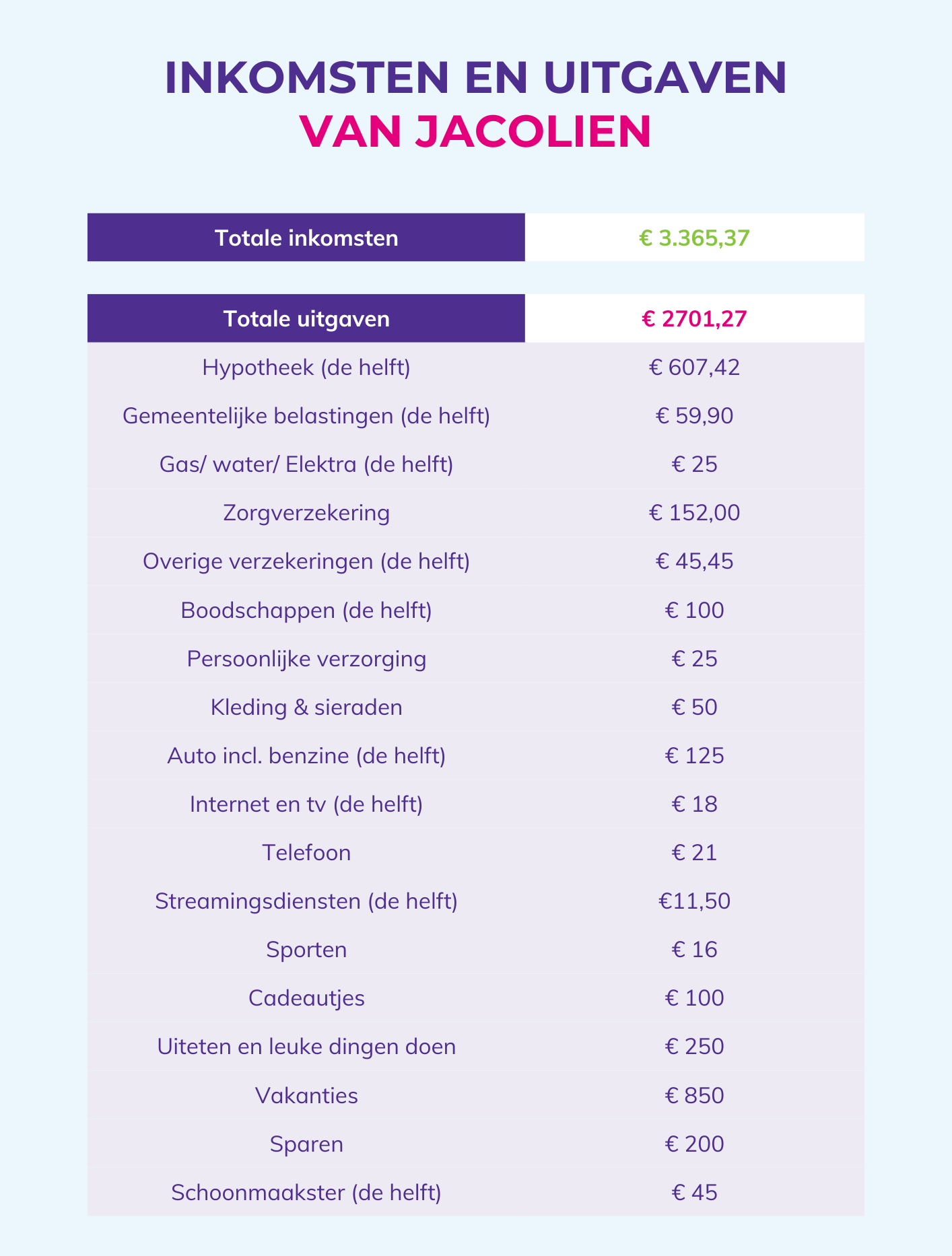 Jacolien geniet volop van het leven, maar bespaart ook waar het kan. Gewoon omdat ze daar energie van krijgt én ze zo meer overhoudt voor wat ze echt belangrijk vindt: uitjes en vakantie. Wij geven haar groot gelijk!