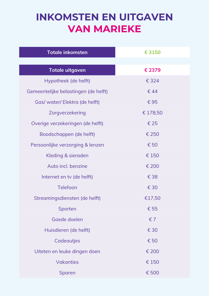 Marieke woont samen met haar man Bart en kat Kai in een koopwoning in het mooie Gelderland. Ze is 32 uur in de week werkzaam als ambulant begeleider. Daarmee ondersteunt en begeleidt ze cliënten met diverse hulpvragen in hun eigen leefomgeving. Dat doet ze inmiddels al zes jaar met veel plezier. En daar houdt ze ook een fijn salaris aan over.
