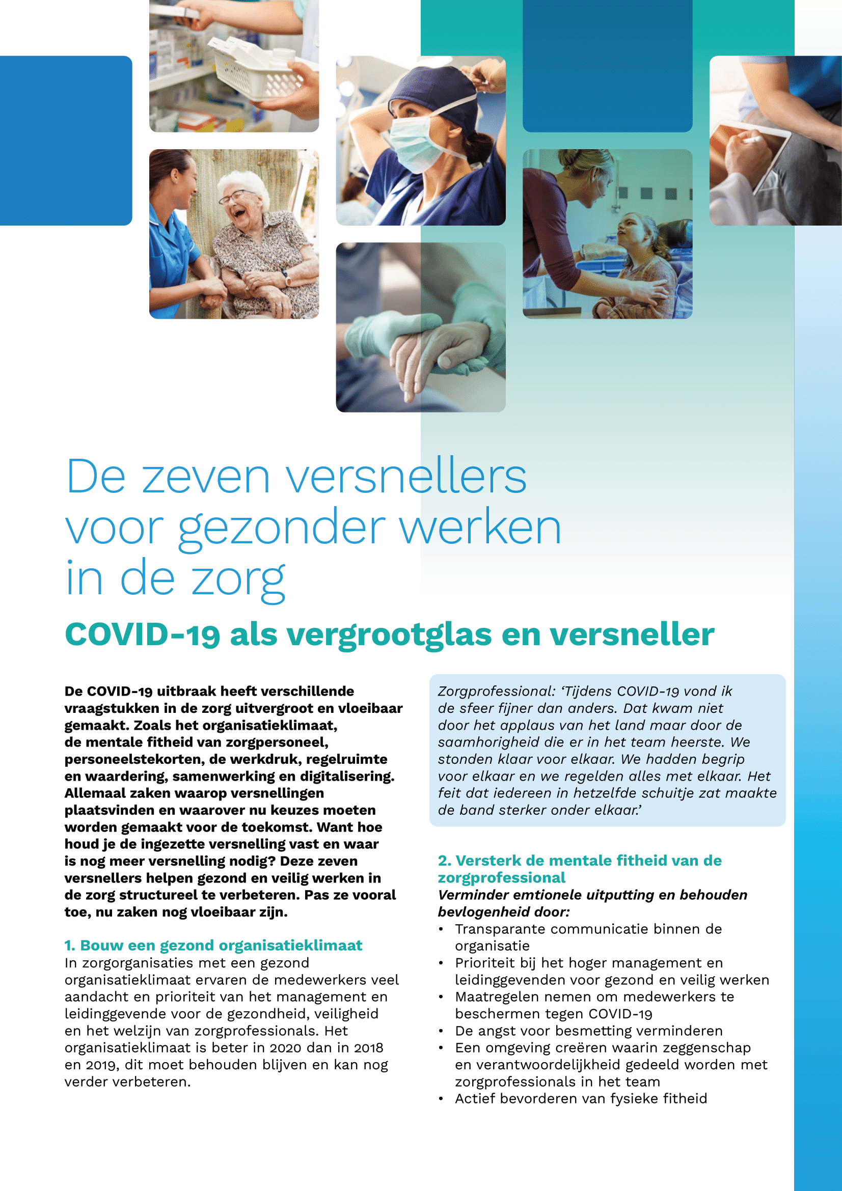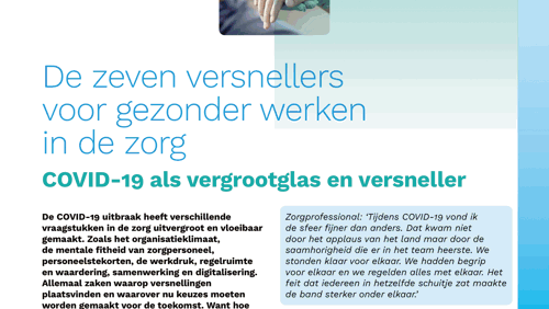 De COVID-19 uitbraak heeft verschillende vraagstukken in de zorg uitvergroot en vloeibaar gemaakt. Zoals het organisatieklimaat, de mentale fitheid van zorgpersoneel, personeelstekorten, de werkdruk, regelruimte en waardering, samenwerking en digitalisering. Allemaal zaken waarop versnellingen plaatsvinden en waarover nu keuzes moeten worden gemaakt voor de toekomst. Want hoe houd je de ingezette versnelling vast en waar is nog meer versnelling nodig? Deze zeven versnellers helpen gezond en veilig werken in de zorg structureel te verbeteren. Pas ze vooral toe, nu zaken nog vloeibaar zijn.