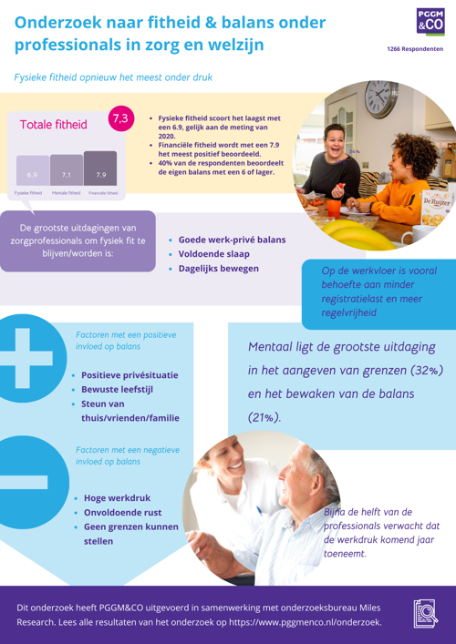 De druk op medewerkers in zorg en welzijn is groot. Dat werd door COVID-19 nog eens extra bevestigd. PGGM&CO zet zich in voor fitte medewerkers in zorg en welzijn. Op fysiek, mentaal en financieel gebied. Daarom zijn we vorig jaar getart met een onderzoek naar fitheid en balans. Ook dit jaar doen we dit onderzoek ieder kwartaal zodat we weten hoe fit jij je nu als professional voelt en wat jou bezighoudt. De resultaten van het onderzoek geven ons inzicht om jou hier nóg beter bij te helpen.