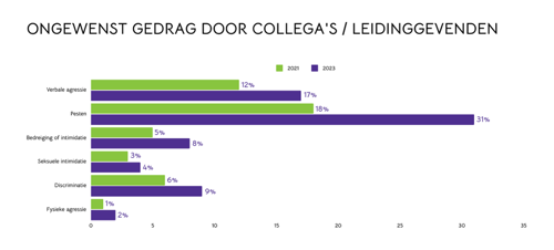 Iedereen moet kunnen werken in een sociaal, psychisch en fysiek veilige omgeving. Toch heeft vrijwel iedere ondervraagde wel eens te maken gehad met ongewenst gedrag, met name van patiënten/cliënten (84%). Alhoewel ongewenst gedrag van collega's/ leidinggevenden minder vaak voor komt, geeft toch 31% van de ondervraagden aan wel eens tot vaak door hen gepest te worden. Waarvan 15% bestaat uit verbale agressie. Onder andere die cijfers zorgen voor een toename van 72% van ongewenst gedrag ten opzichte van 2021.